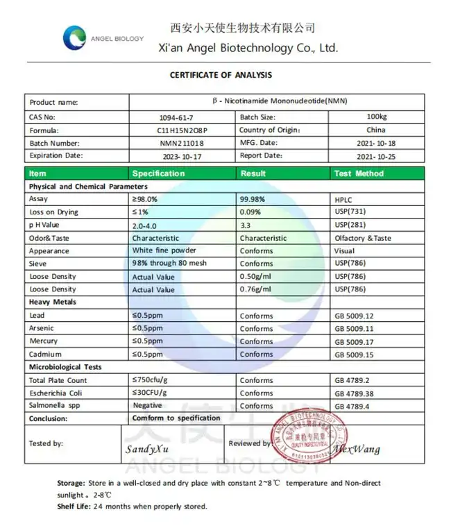 Angelbio offers customized OEM services for Bulk NMN Powder. We can tailor product formulations, packaging designs, and labels to meet the specific needs of your brand and market. Whether you require smaller quantities or large-scale manufacturing, our team is committed to delivering high-quality, bespoke solutions.